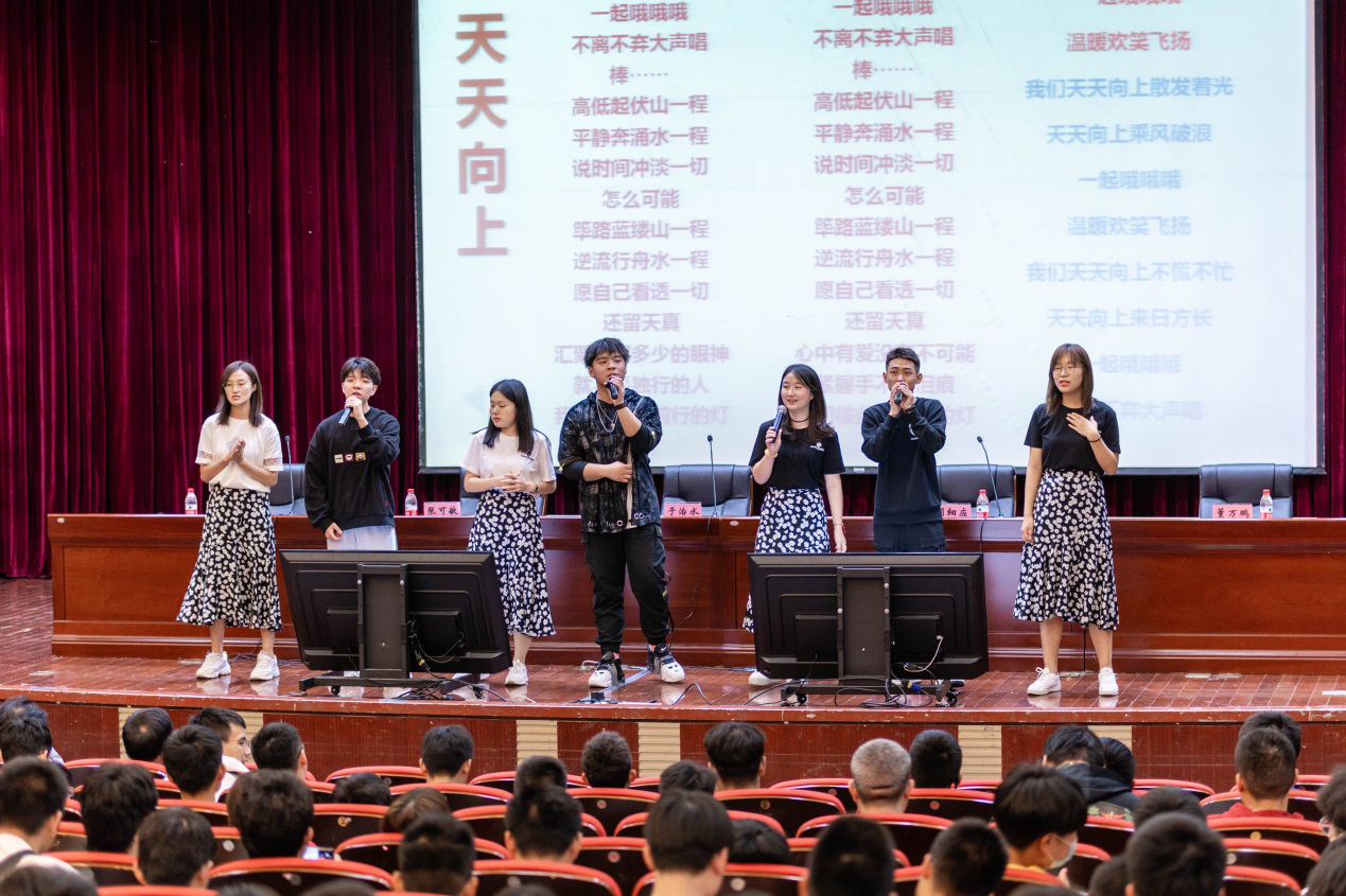 典礼上,辅导员和学生代表还共同为新生们演唱了《天天向上》曲目,希望每一位新生都能在接下来的学习生活中乘风破浪、天天向上;材料工程学院大学生思政讲师团为新生带来了“大学生讲思政——百炼成钢材料人,伟大复兴中国梦”的演讲,引起了现场同学们的热烈反响。