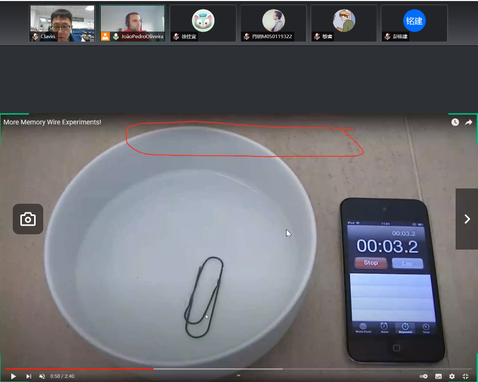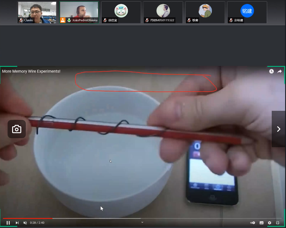 JPO教授以一则短视频为开场,将一条缠绕在钢笔上的合金取下放入热水后,在极短的时间下边收缩恢复为一枚曲别针(如图2所示),用极简单的小实验打开了同学们对记忆合金的兴趣。他指出:“这其实是形状记忆效应所产生的效果,通过热弹性与马氏体相变及其逆变而使合金具有形状记忆效应。”