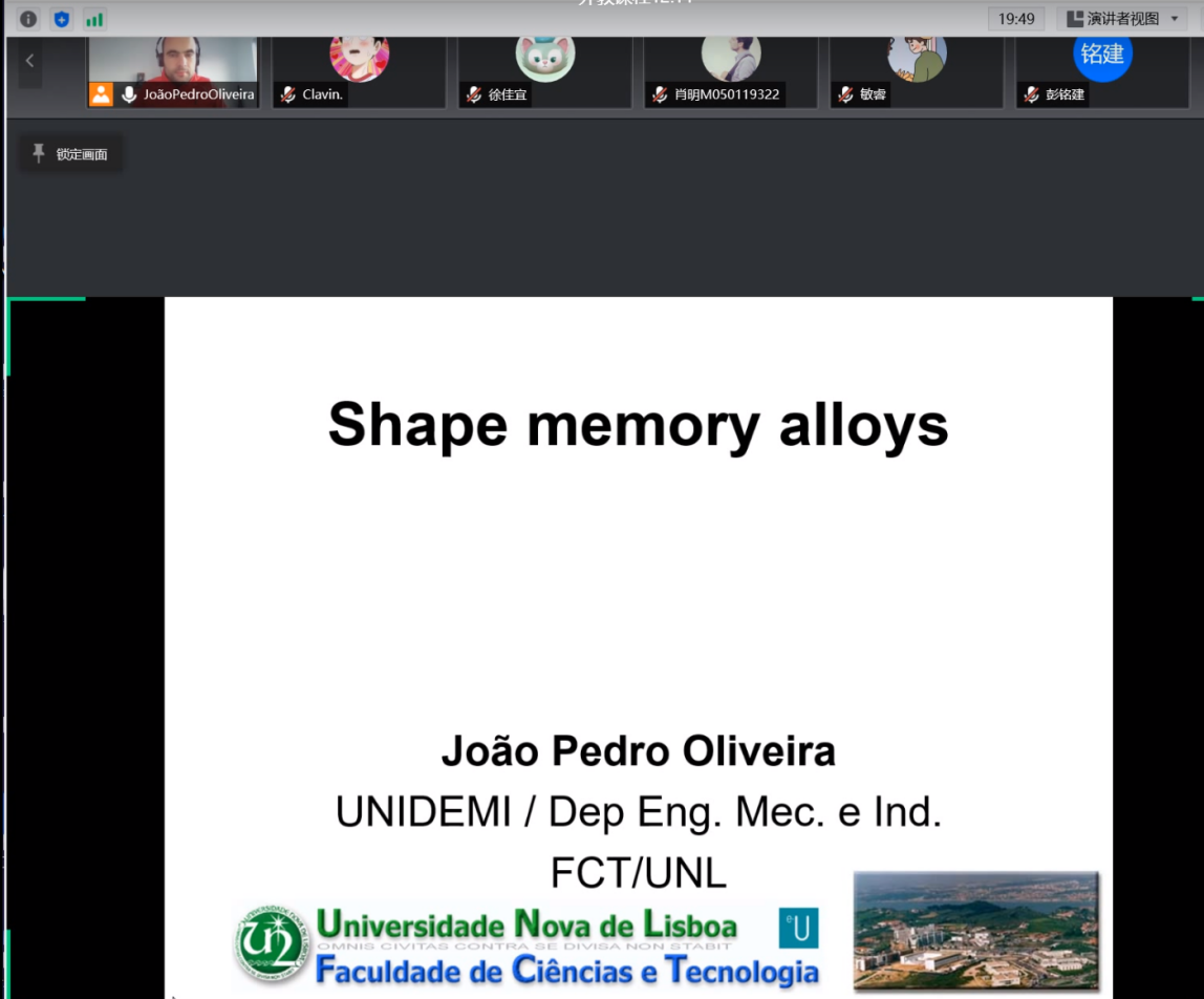 2021年12月11日,葡萄牙新里斯本大学Joao Pedro Oliveira(JPO)教授受邀为我院研究生开展了一堂以“形状记忆合金”为主题的线上学术讲座,讲座主持人材料工程学院杨瑾副教授,我院学生也积极参与本次讲座(如图1所示)。